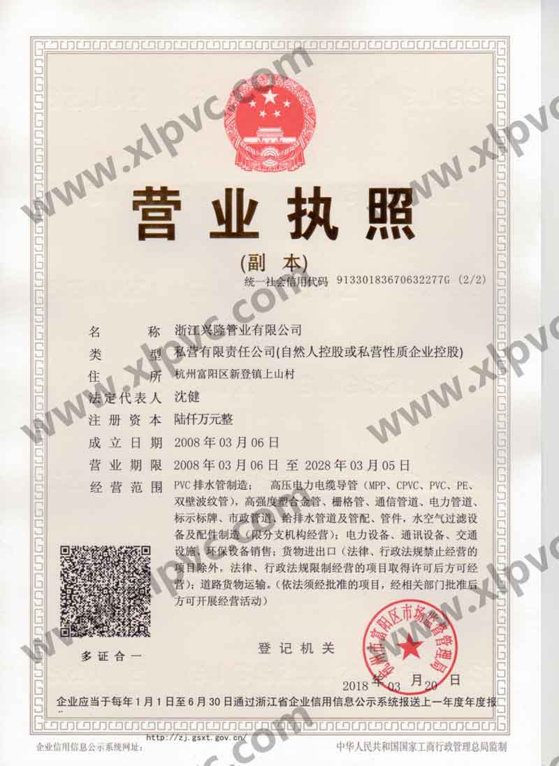 浙江興隆管業(yè)有限公司位于杭州市富陽區(qū)(杭州第九新區(qū)),坐落在新登鎮(zhèn),相距杭州僅60公里,水、陸、空交通運(yùn)輸十分便利。浙江興隆管業(yè)有限公司前身為富陽興隆塑料制品廠,成立于1992年,2008年改名浙江興隆管業(yè)有限公司,數(shù)十年來,公司一直至力于管道的生產(chǎn),目前公司擁有國內(nèi)先進(jìn)的CPVC保護(hù)管生產(chǎn)線,HPVC()雙壁波紋管生產(chǎn)線,多孔管生產(chǎn)線,玻璃鋼電纜保護(hù)管生產(chǎn)線、MPP電纜保護(hù)管生產(chǎn)線。生產(chǎn)的主要產(chǎn)品有:CPVC電纜保護(hù)管、MPP電力電纜保護(hù)管(頂管)、高強(qiáng)度塑合金管、HDPE給排水管、HPVC()雙壁波紋管、玻璃鋼電纜保護(hù)管、埋地通信用的PVC-U多孔管、PE直壁管、PVC-U雙壁波紋管、梅花管等,年生產(chǎn)能力達(dá)20000萬米。